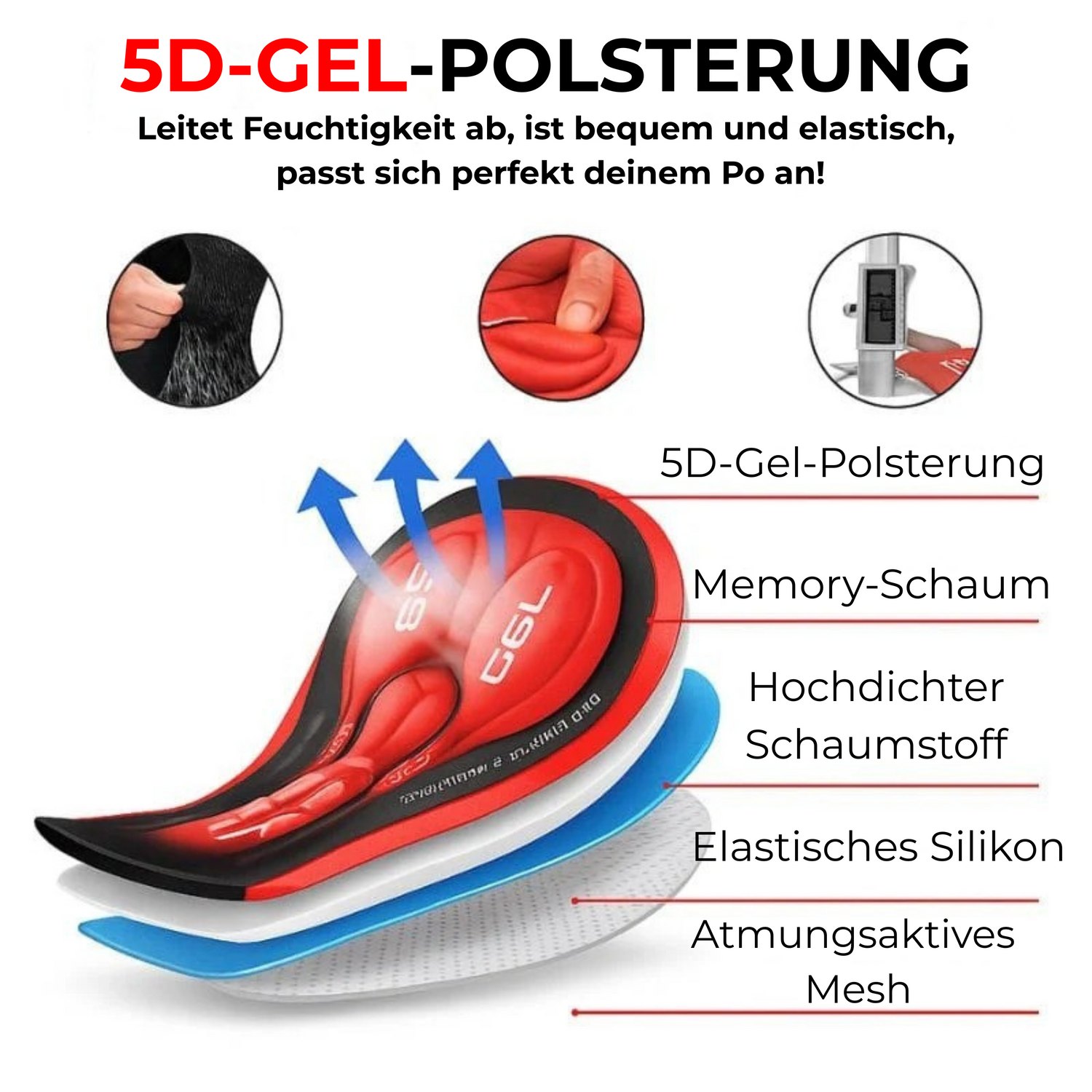 Polsterung: Silikongel kombiniert mit hochdichtem Schaumstoff